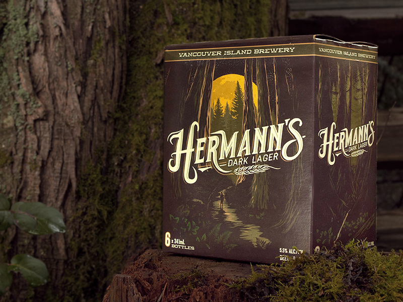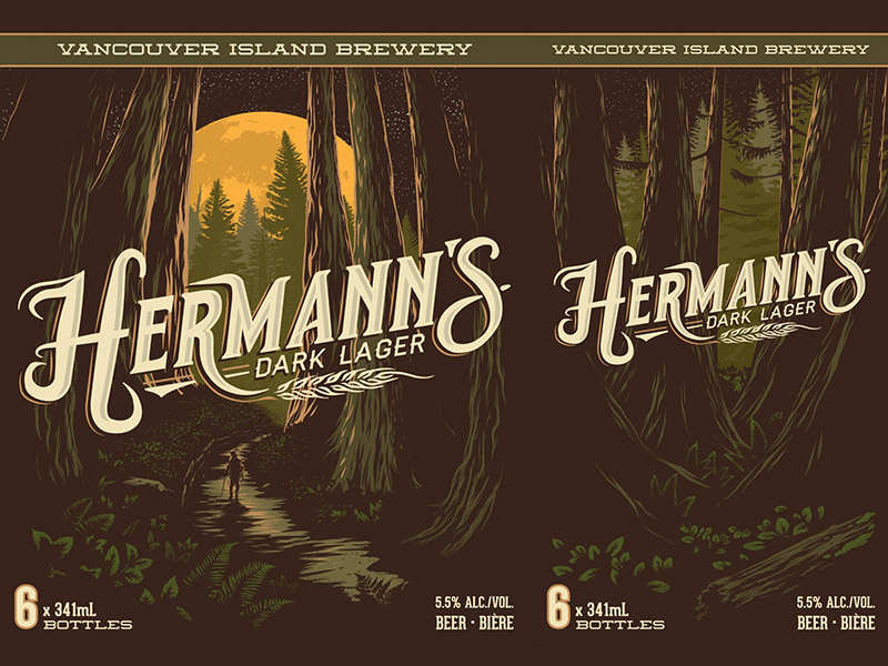 This project was part of a re-branding for Vancouver Island Brewery’s core brands. I worked on this with McAllister Marketing. The goal for all the artwork for the core brands was to celebrate the Island landscapes. For this brand we chose to highlight Vancouver Island’s old growth forests. As Hermann’s is a dark beer we decided that a night scene would be best. All of the cases for the core brands are continuous scenes that wrap around the case.
